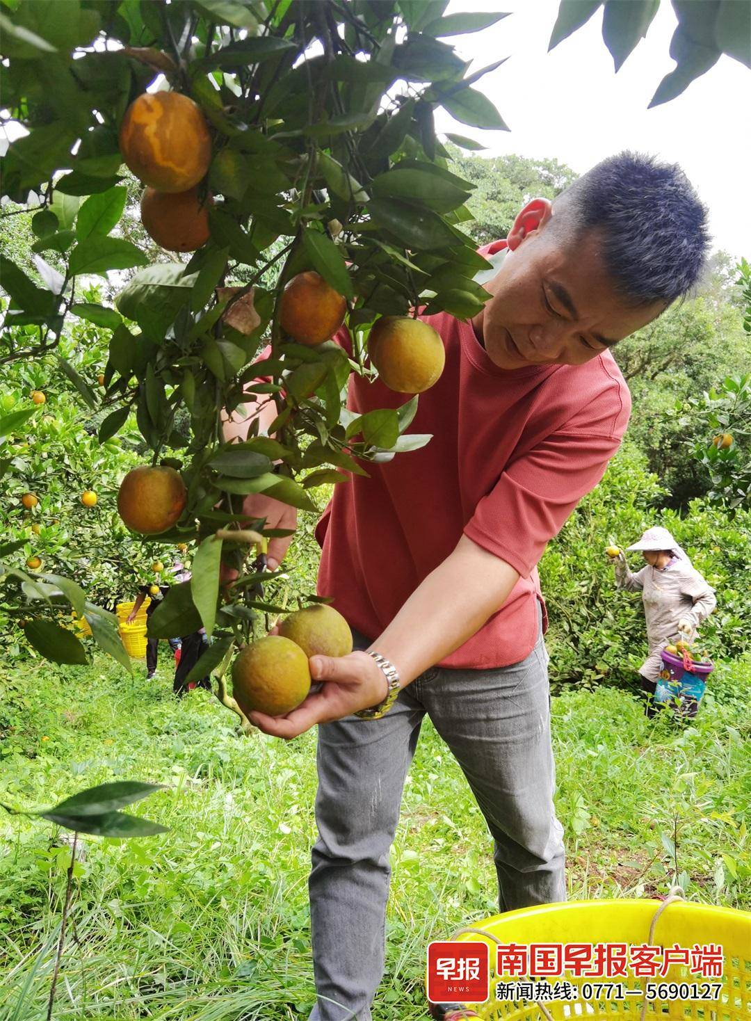 6月6日下午,在荔浦市双江镇永福村的橙园里,果农忙着采摘夏橙。南国早报全媒体记者看到,既有成熟变黄的夏橙,也有青色的夏橙小果。村民林先生说,黄色的夏橙是去年结的果,在树上的生长期已达13个月之久,青色小果则是今年开花结的果。