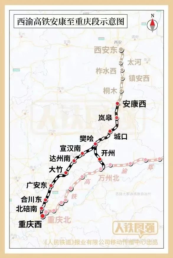 康渝高铁(西渝高铁安康至重庆段)是我国“八纵八横”高铁网北京至昆明的京昆通道和包头、银川至海口的包(银)海通道的重要组成部分。线路自安康西站起,经陕西省安康市,重庆市城口县,四川省达州市、广安市,重庆市合川区、北碚区,引入重庆枢纽重庆西站,共设安康西、岚皋、城口、樊哙、宣汉南、达州南、大竹、广安东、合川东、北碚南、重庆西11座车站,其中重庆西为既有车站,其他为新建车站。
