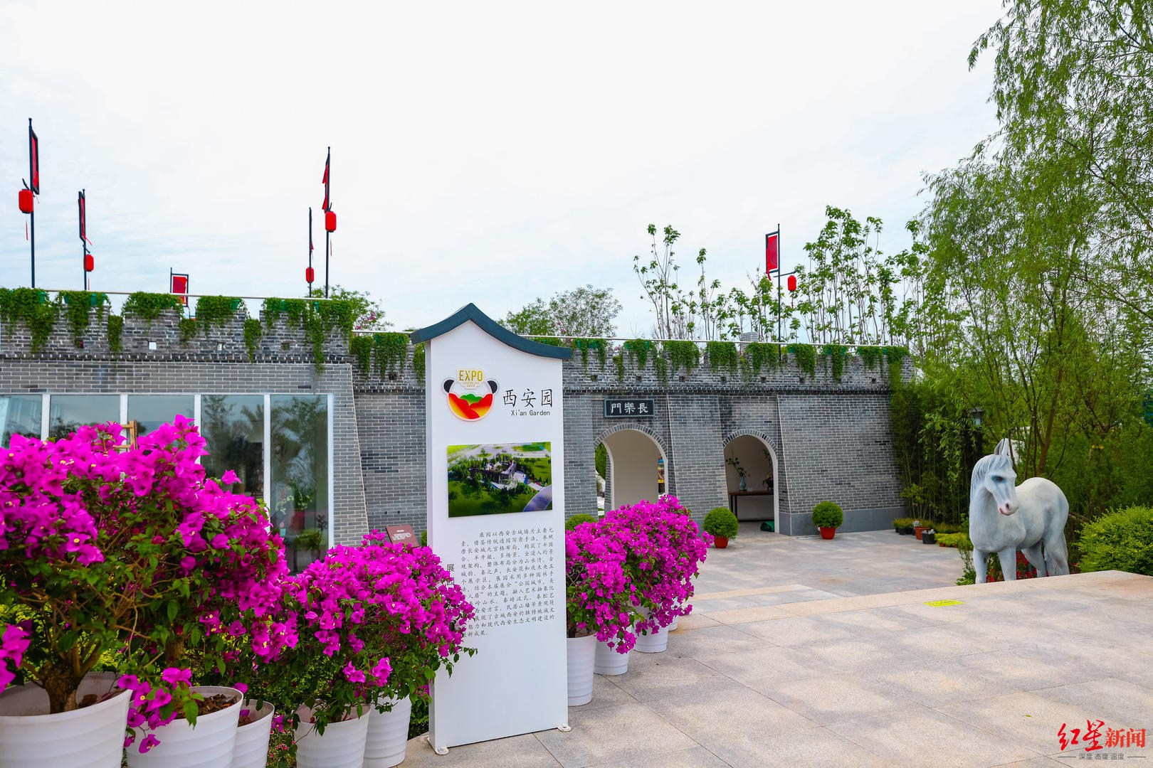 据了解,西安展园总占地面积1500㎡,呈东南高西北低走势,高差约8米。展园以西安古城墙为主要元素,借鉴传统造园写意手法,参照唐长安城九宫格布局,构筑了半围合、半开敞、多场景、全浸入的景观架构,整体布局分为山水情、古城韵、秦之声、长安花和夜未央五个展示区,是本届世园会唯一的“古城墙展示区”,并建有本届世园会唯一的“雨水回收灌溉系统”。展园采用多种园林手法,结合本届展会“公园城市,美好人居”的主题,融入艺术抽象化的秦岭山水、秦砖汉瓦、秦腔艺术、西安方言、民居山墙等景观符号,展现了古城西安的独特地域文化魅力和现代西安生态文明建设的最新成果。