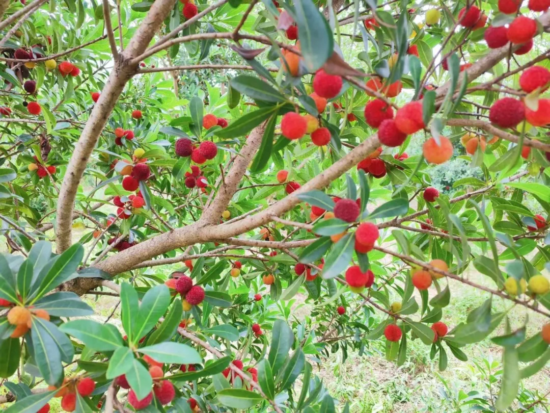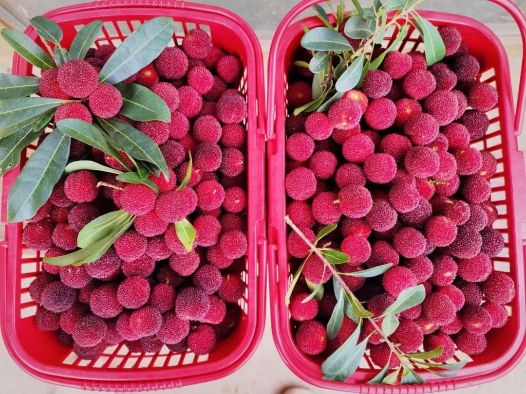 游客们尽情体验着采摘的乐趣,不一会儿,提篮里便装满了新鲜的杨梅。