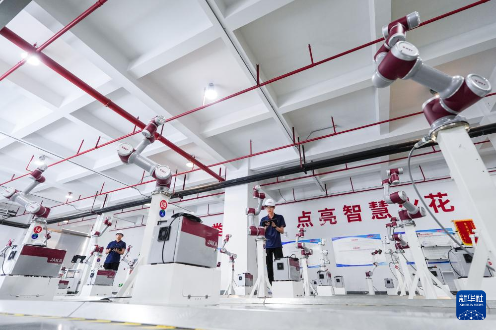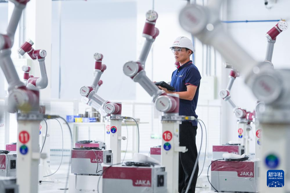 6月14日,在位于常州市武进区的常州节卡智能装备有限公司制造基地,工作人员在对柔性智能协作机器人进行全系列测试。新华社记者 李博 摄