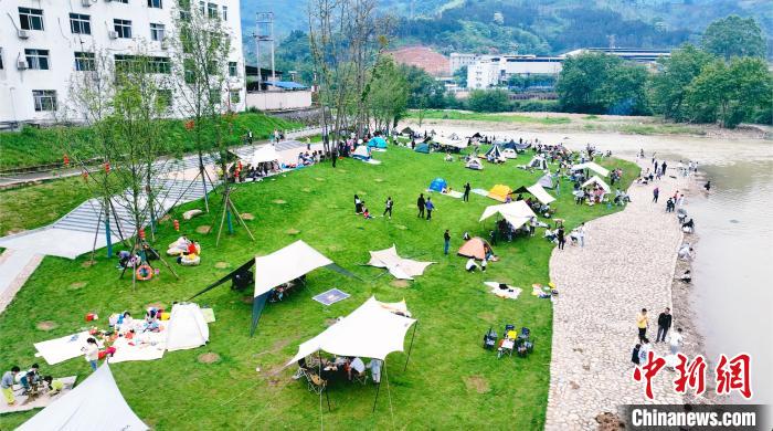中新网记者现场看到,河滩边建有5座小木屋,用于租给村民经营,增加收入。每逢节假日游客高峰时,村民廖逢珠便会来到河滩边售卖本地特色小吃和农特产品。她说,旅游旺季,在这卖鼠曲饼、茶叶蛋和一些当地特产,一天能有七八百元的收入。