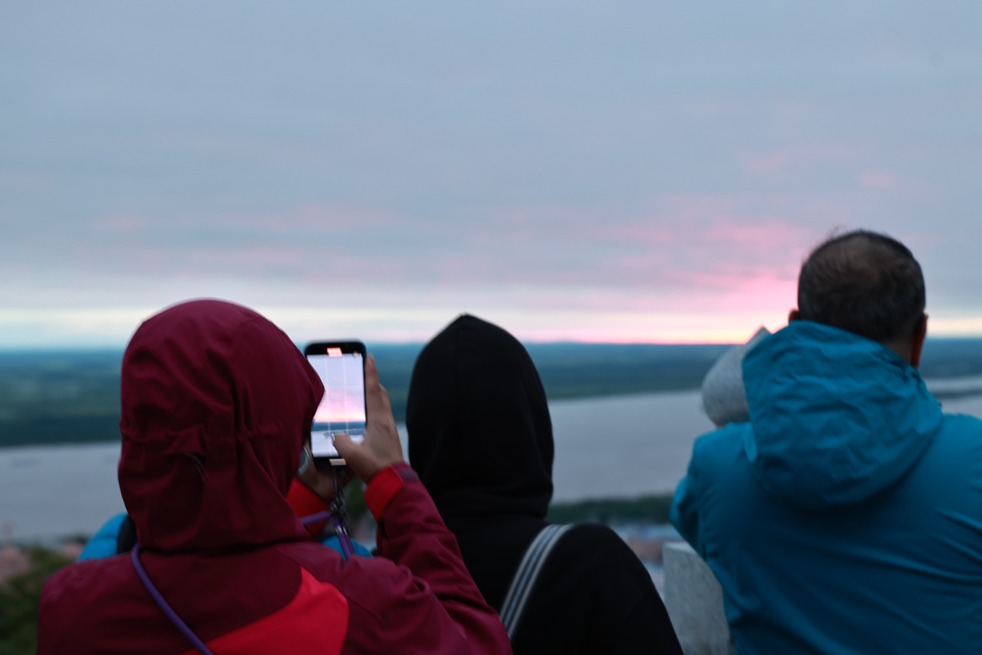 6月21日凌晨,市民、游客、摄影爱好者在抚远东极阁迎接璀璨朝霞(央广网发 李拥军 摄)