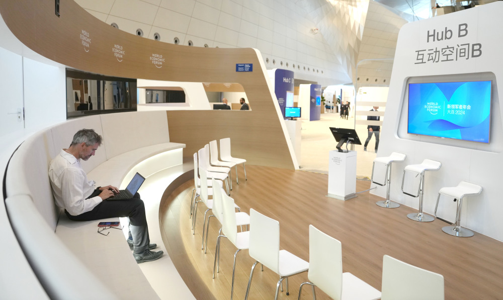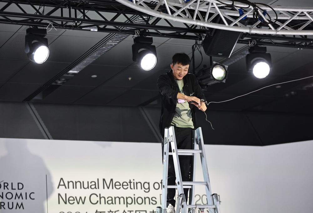 6月24日,工作人员在夏季达沃斯论坛主会场大连国际会议中心内的互动空间B工作。新华社记者 章磊 摄