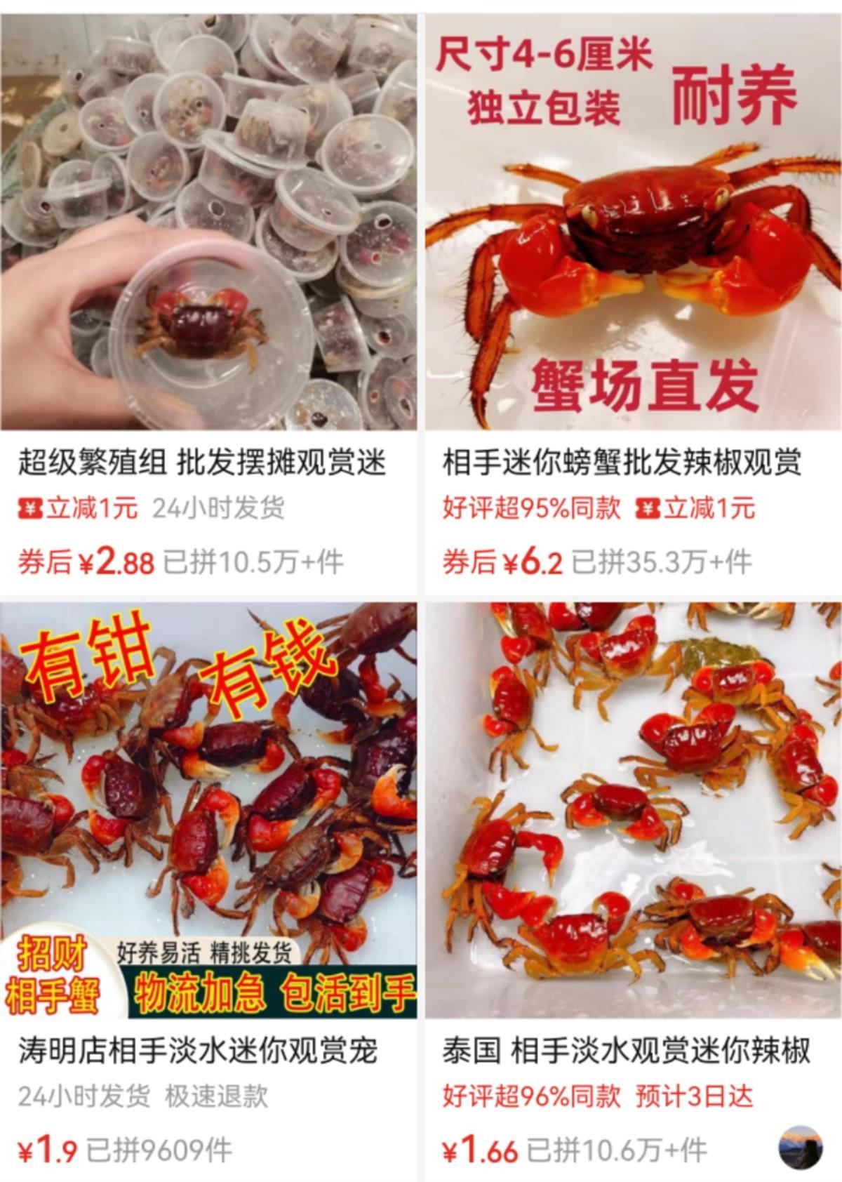 “儿子一次无意在手机上刷到了‘相守蟹’的视频,就比成年人指甲盖大一点,感觉这么小的螃蟹会很好玩,就一直闹着要买。”他介绍,在电商平台搜索发现价格不贵,平均一只就几块钱,还送装饰物,“我就下单了,卖家还送了点螃蟹的食物。”
