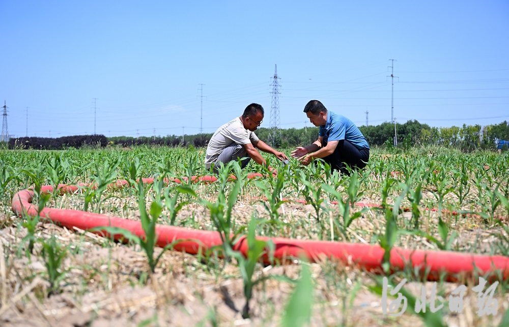 6月25日,邢台市南和区水务局工作人员王瑞利(右)在和阳镇张李召村玉米地指导农民利用喷灌设备抗旱。连日来,邢台市南和区相关部门组织技术人员深入田间一线,指导农民做好灌溉、施肥等玉米田间管理工作,多措并举抗旱保苗。河北日报记者赵永辉摄