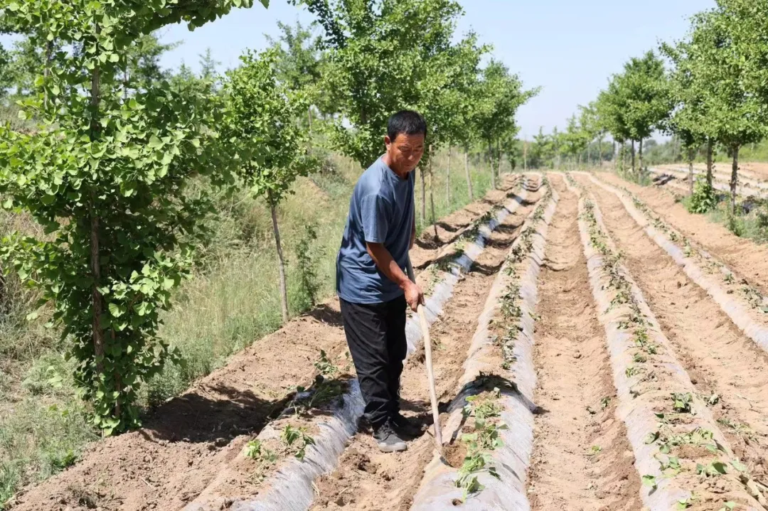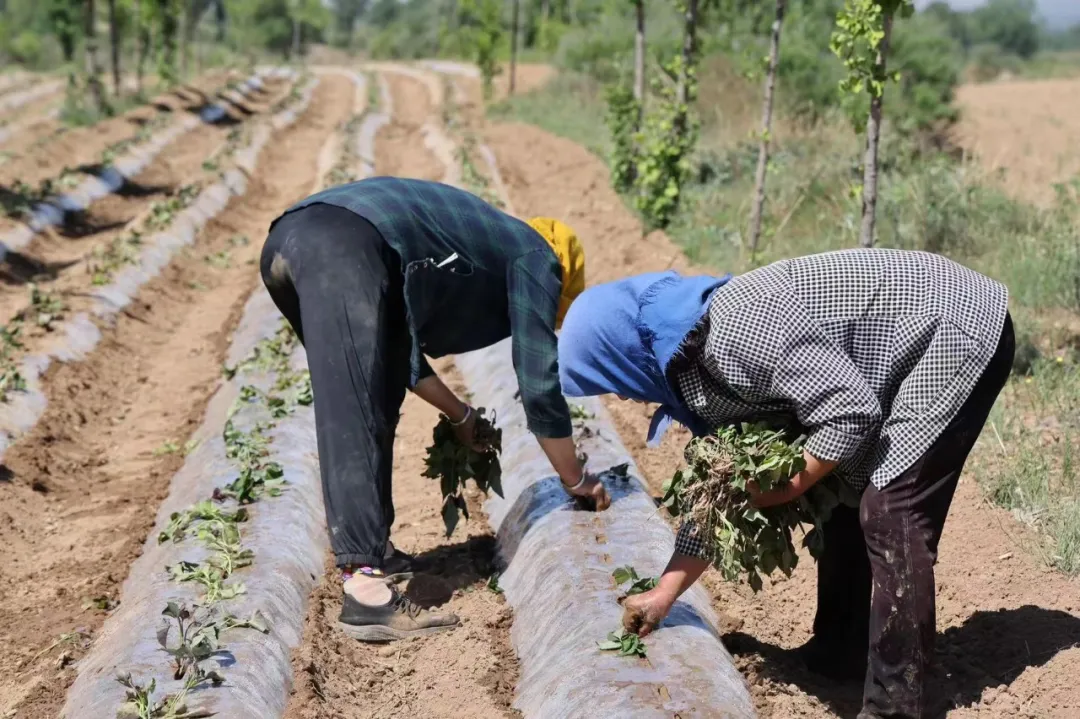 苏全虎告诉记者,由于天气干燥,合作社也在不断改善种植方法,近两年采用膜下旱地滴灌方法以来,大大提高了种植效率,也相应节省了水资源。“现在栽红薯分三个步骤,先起了沟,然后再开了坑、浇上水、栽上苗子然后埋上土……苗子到现在为止尾声阶段了,基本上栽红薯已经结束了,今年主要品种还是济26为主,还有些哈密、烟薯(品种)。”苏全虎一边铲着土一边照料着其他人的进度,还不忘介绍地里的情况。
