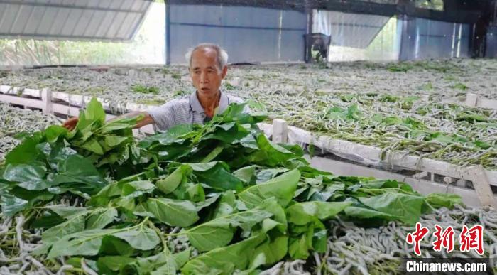 蚕房内,养蚕大户周家茂正将新鲜的桑叶铺在架子上,一条条雪白肥胖的蚕吃得不亦乐乎。“我从1991年开始养蚕,从2亩地发展到350亩地,蚕房超3000平方米,现在每年能够产出500多张蚕、干茧10吨,年毛收入120万元左右。”