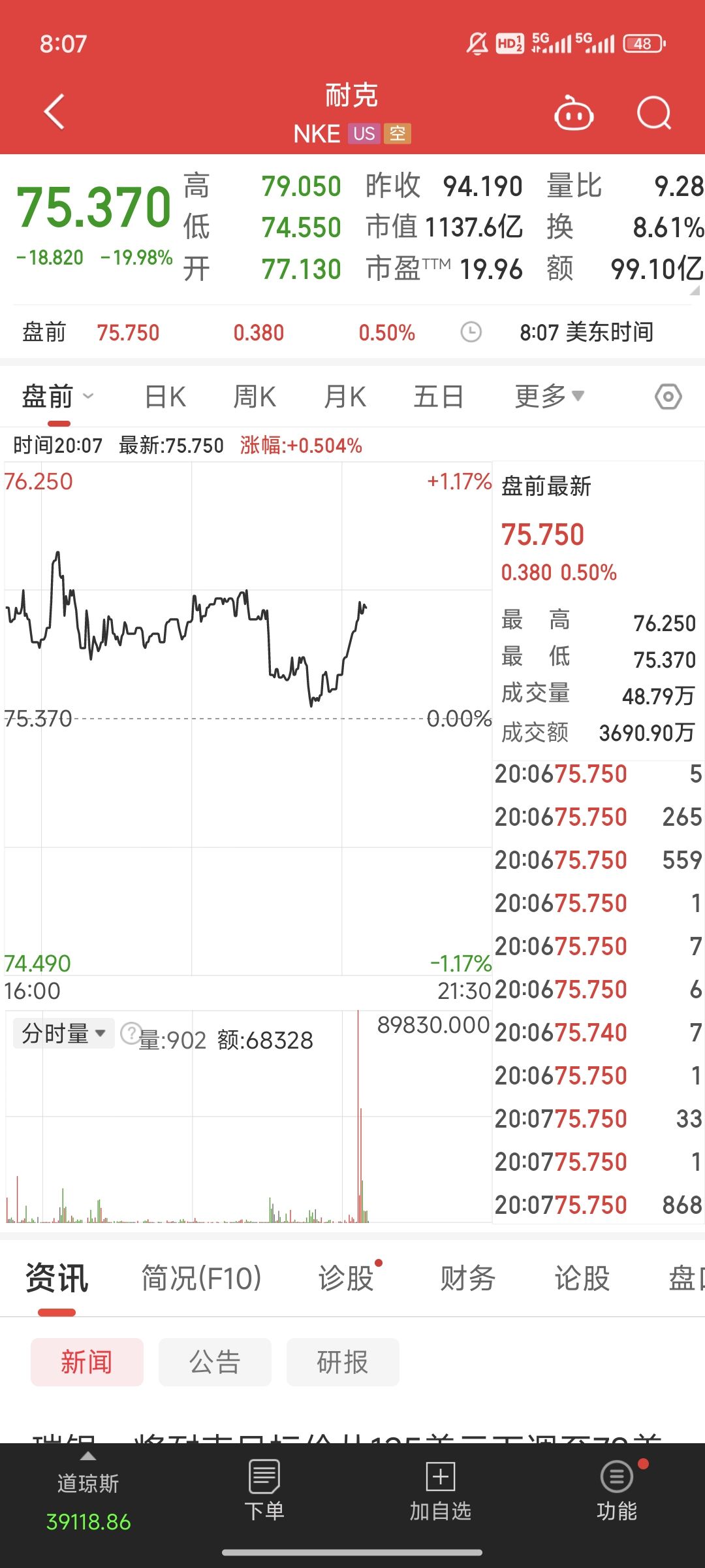 这份不及预期的“成绩单”引发了资本市场的剧烈反应。截至当地时间6月28日收盘,耐克股价暴跌19.98%,收盘报75.37美元/股,市值蒸发约284.1亿美元(约人民币2064.6亿元),较2023年底跌30%。