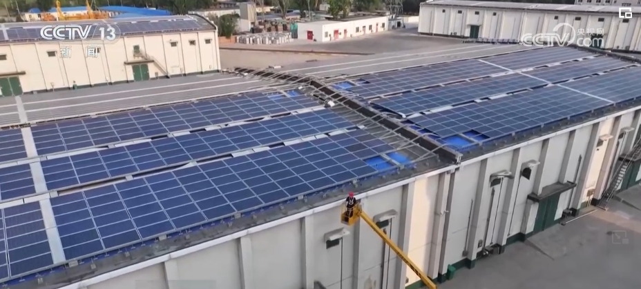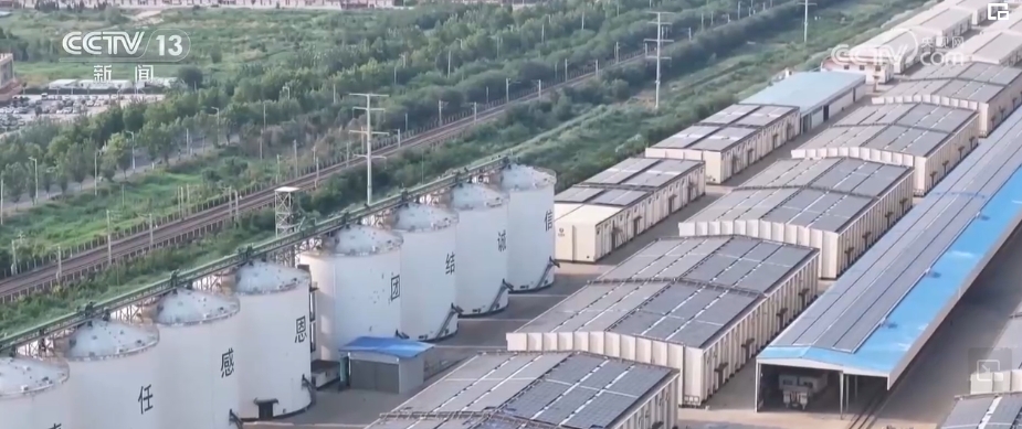 从无人机视角提供的全景画面中,能看到这座粮食平房仓顶被1584块光伏板组成的1800平方米光伏矩阵覆盖。工作人员介绍,这片光伏矩阵在夏季能将仓内空间温度降低3—5摄氏度。
