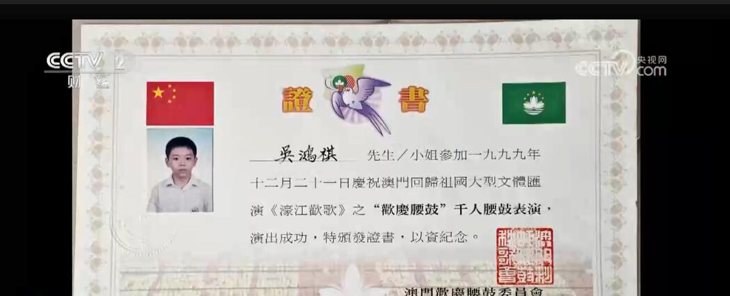 这是1999年庆祝澳门回归祖国大型文体汇演的场景,上千澳门学生在现场打起腰鼓庆祝回归,12岁的吴鸿祺就在其中。25年过去了,如今37岁的他已经是一家科技公司的执行董事。
