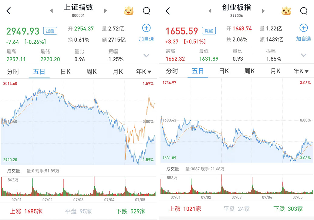 至7月5日收盘,上证综指跌0.26%,报2949.93点;科创50指数涨1.23%,报698.85点;深证成指涨0.25%,报8695.55点;创业板指涨0.51%,报1655.59点。