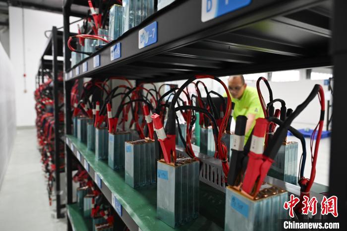 梯次利用电池展示。据悉,动力电池退役时还有剩余储电能力,规范处理后可梯次利用。近年来,重庆市潼南区围绕废旧动力电池梯次利用、报废汽车拆解和汽车零部件再制造等业态,加快推进汽车后市场产业布局,全力打造中国第一汽车后市场基地。 中新社记者何蓬磊摄