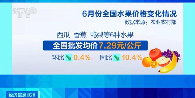 农业农村部数据显示,6月份重点监测的西瓜、香蕉、鸭梨等6种水果全国批发均价为每公斤7.29元,环比下降0.4%,同比下降10.4%。