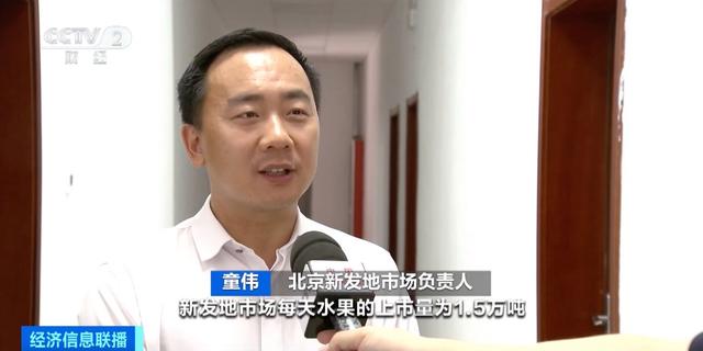 北京新发地市场负责人 童伟:新发地市场每天水果的上市量是1.5万吨,有270多个品类,供应特别充足。夏天的水果像西瓜有比较明显的降价,麒麟瓜由每斤2.4元下降到每斤1.8元。