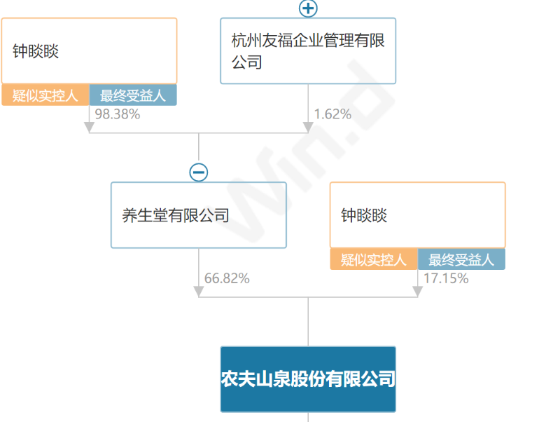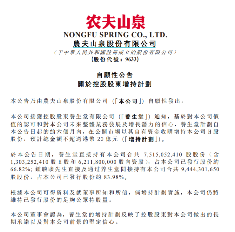 截至公告日,养生堂直接持有本公司合共75.15亿股股份,占公司已发行股份的66.82%;董事长钟睒睒直接及通过养生堂间接持有公司已发行的83.97%股股份。