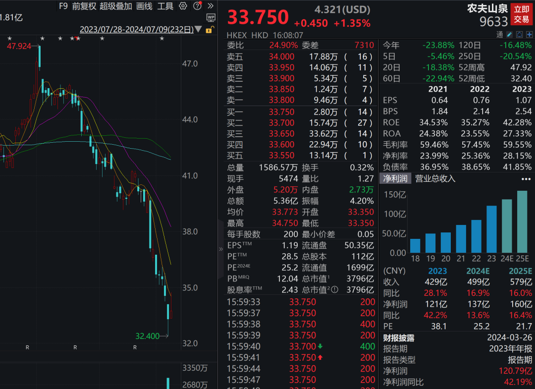 近期,农夫山泉的股价持续下跌,自5月3日达到近48港元/股的阶段性高点后一路向下,两个月内跌近30%。