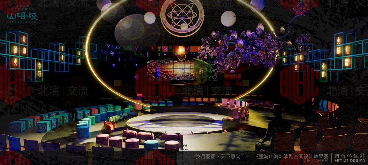 在舞台设计方面,本剧以“岁月图画、天下意向”为视觉隐喻,结合传统文学与现代元素的时空碰撞,构建出山海宇宙“时间观”与“空间观”相结合的沉浸式戏剧世界。另外,本剧在音乐音效、服装造型、新媒体视效等方面均有创新,现代感和科技感十足。
