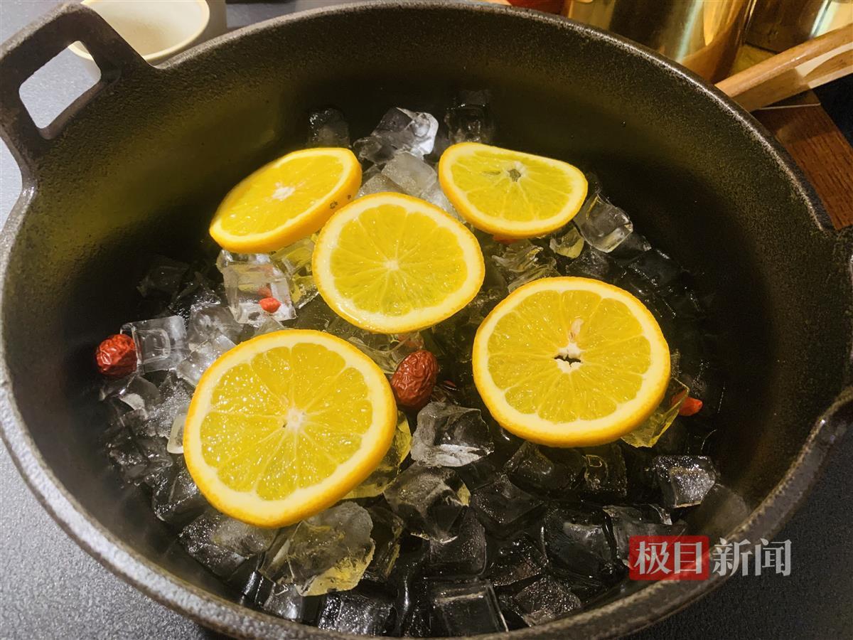 在武汉市芦沟桥路的一家火锅店内,记者看到,一款二十四节气都能吃的药膳火锅成为店内主打。“夏日,我们主要有两款锅底,一款是药膳鸳鸯锅,一款是药膳锅,价格分别为68元和29.9元。”门店店员小满介绍,“以药膳锅为例,锅底是橙子切片、红枣和冰块,我们还会加入黑灵芝、土茯苓、葛根、党参等,再加入鸡汤进行烹煮,锅底比较鲜美。”