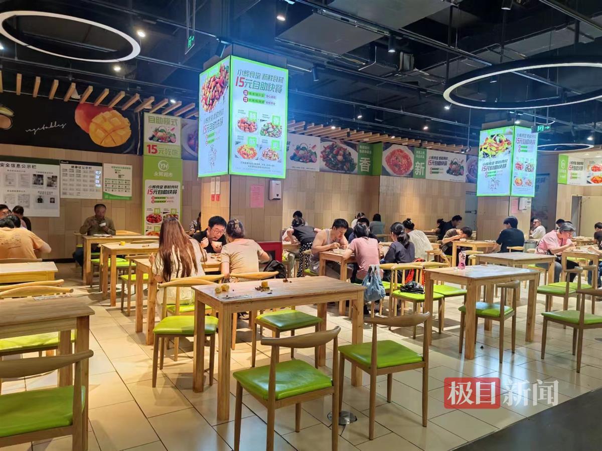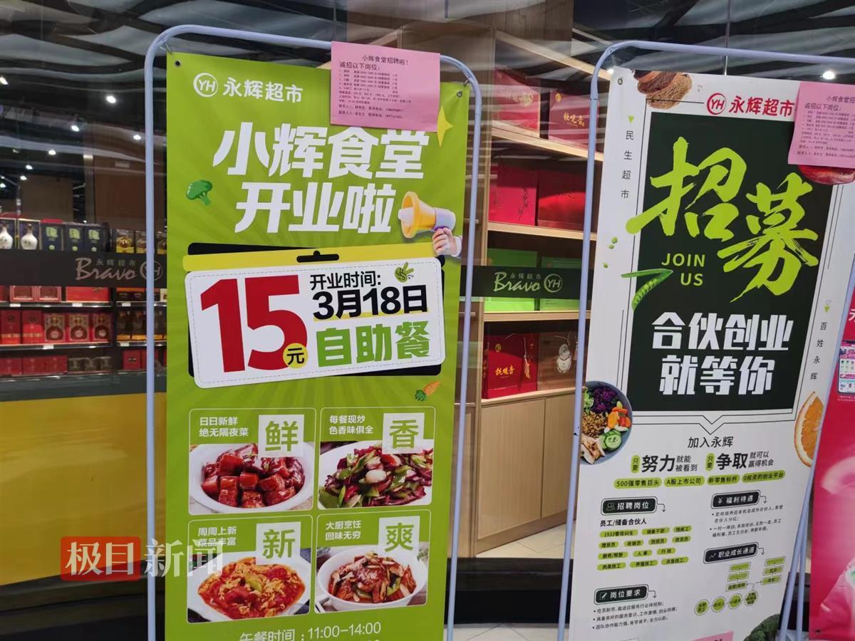 18日中午,在武汉关山大道泛悦城永辉超市,极目新闻记者看到,超市门口有大幅海报,写着“小辉食堂开业啦”,自助餐仅15元,售卖时间为午餐11时至14时,晚餐17时至19时。
