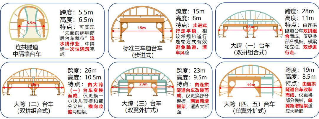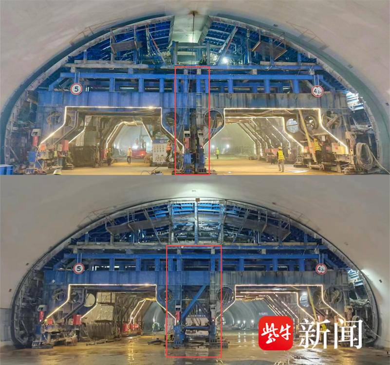 其中,步进式行走系统有效避免了常规轨道行走轮方式容易出现的跳道、溜车、倾覆等风险,具有行走平稳、停放稳固等优点;快速变断面技术能够在不拆卸整体框架的情况下,仅更换一小块顶模和部分立柱,横向收缩两框架,快速实现不同断面的转换,让台车提高施工效率,保证施工质量的同时,大幅降低多次拆装带来的作业风险。