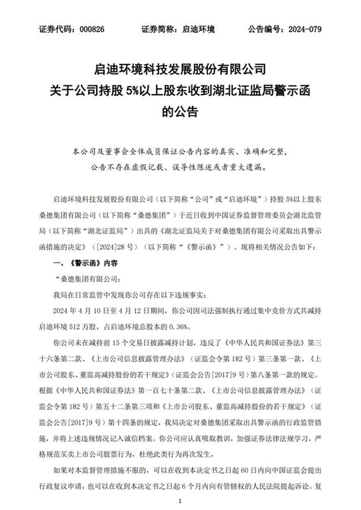 继被深交所通报批评后,7月26日,启迪环境科技发展股份有限公司(证券代码:000826,简称启迪环境)对外公告称,公司第四大股东桑德集团有限公司(简称桑德集团)再收湖北证监局《警示函》。原因均系桑德集团未在减持前15个交易日披露减持计划,违反有关规定。