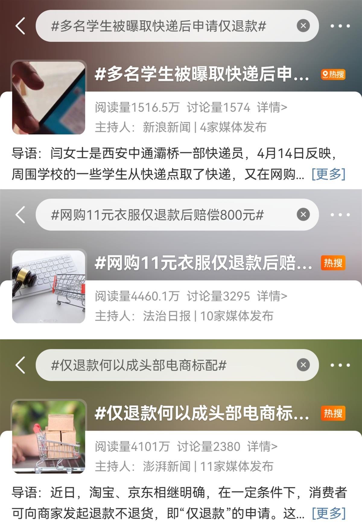 而且,一些消费者与电商卖家的矛盾也被激化,“仅退款”相关话题多次登上热搜。