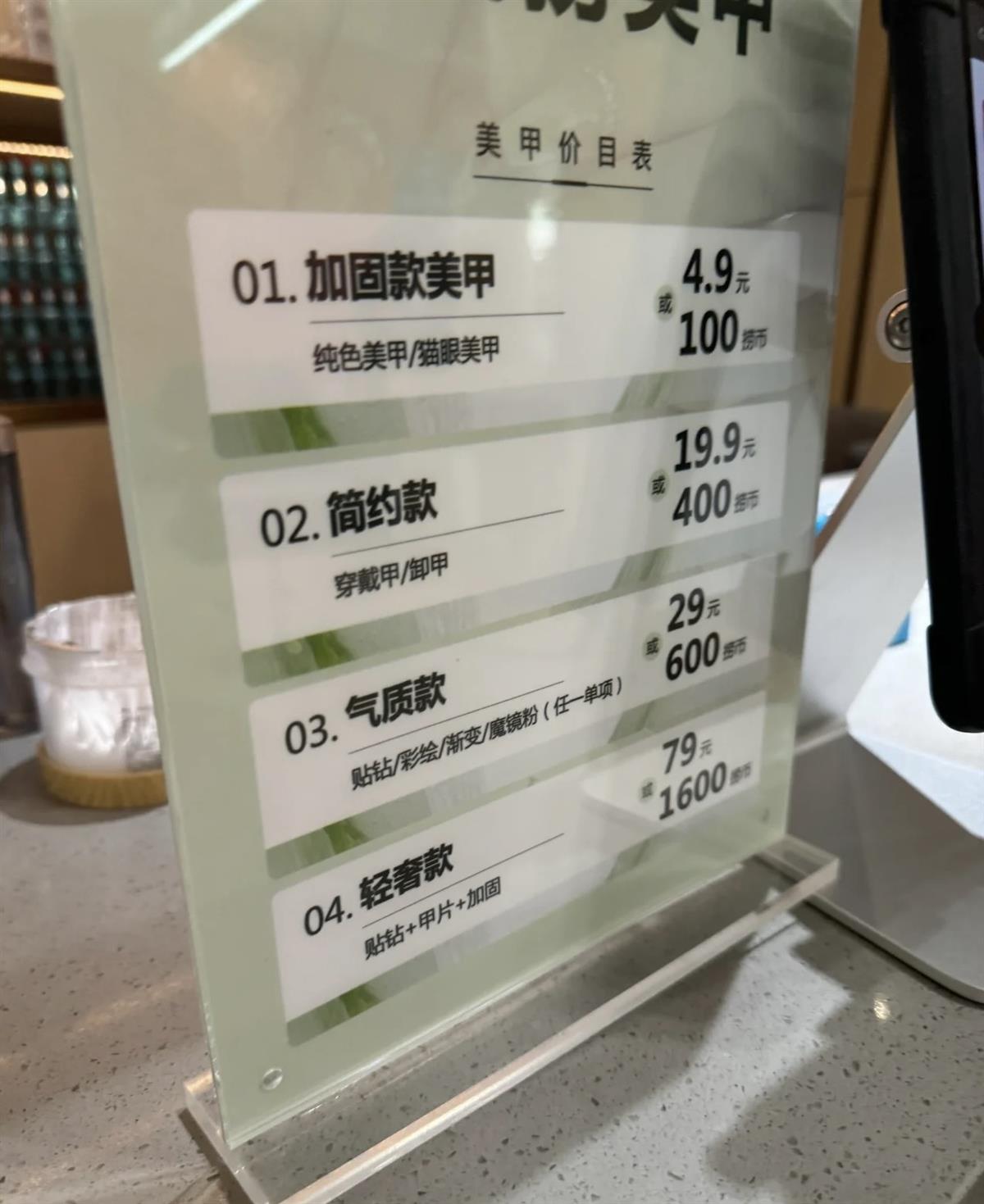 图片显示,该门店内纯色美甲、猫眼美甲需4.9元或100捞币,穿戴甲或卸甲需19.9元或400捞币,任选贴钻、彩绘、渐变或魔镜粉需29元或600捞币,如果贴钻、甲片和加固同时做,则需79元或1600捞币。