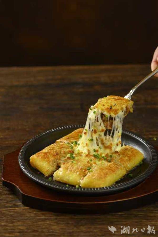 在馅料中,加入意大利马苏里拉芝士,用铁板装盘上桌,让武汉传统小吃“豆皮”能拉丝。