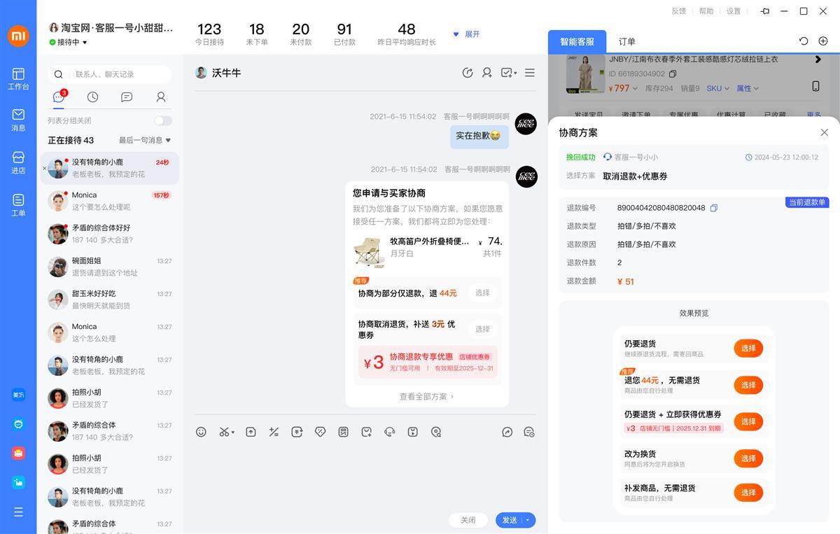 在具体操作中,商家主动开启该工具后,可根据自身情况,自主在后台为不同售后场景分别配置针对性协商方案;在消费者发起退款单或因售后问题联系客服后,该工具会自动发送安抚话术及多种协商方案。如果消费者对协商方案满意并选择对应方案,系统将自动执行商家预设的现金投放、优惠券投放、同意退款申请等操作。