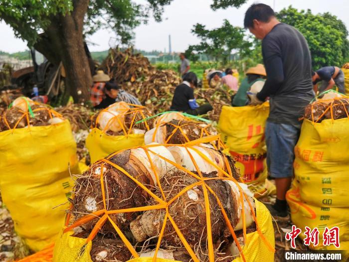 “这片近百亩的芋田,是从昨天开始采收的。今天一早30多位老乡结伴而来帮忙拔芋、切苗、分拣、转运、整理、装袋、打包等,一袋袋打包好的芋头,将运至东莞、广州等地批售。”近日,广东台山市四九镇望岗村一种植户周先生透露,他今年首次将荔浦芋引进台山种植。
