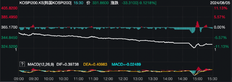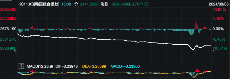 在日本股市下跌之际,亚太区其他市场也惨烈下跌。韩国综合指数盘中跌幅超过10%,盘中触发熔断。韩国KOSDAQ指数盘中跌幅则超过13%,盘中同样触发熔断。