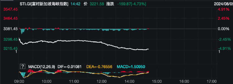 新加坡海峡指数盘中跌幅一度在5%左右。