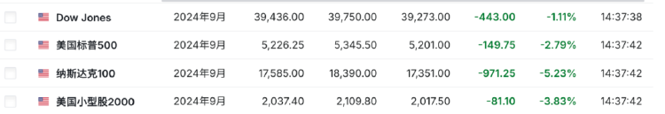 在一系列美国疲软的经济数据公布后,因为担忧美国出现更严重的经济衰退,金融市场随即遭遇剧震,美元指数大跌,美股也开启大跌。2日,美股道指收跌1.51%,纳指收跌2.43%,标普500指数收跌1.84%。截至当日收盘,纳指较7月10日收盘点位下跌超10%,技术上进入调整区间。