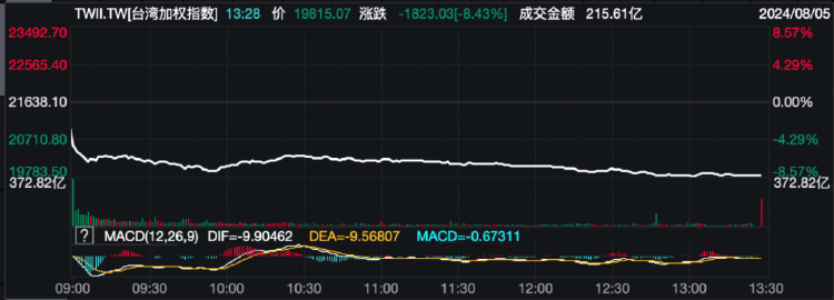 中国台湾地区股市也大跌,台湾加权指数跌幅超过8%。