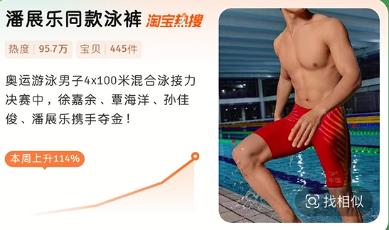 在电商平台上以“潘展乐”为关键词搜索,“潘展乐同款”是消费者关注度最多的条目之一,泳镜等游泳配件打上了“冠军同款”“潘展乐”同款,销量一路飙升,一些店铺中的“潘展乐同款”泳镜已卖断货,其同款泳镜已飙升至竞速泳镜热销榜第一位。“潘展乐同款”泳裤也成为热销单品,淘宝热搜数据显示当前该商品的热度达95.7万。