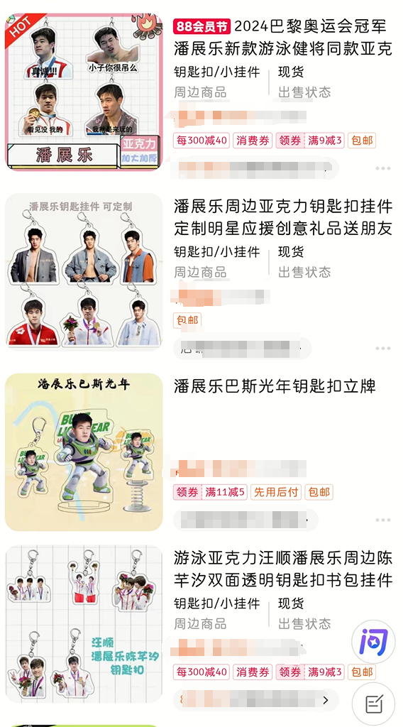 不仅是潘展乐同款火了,潘展乐本身也成为了电商平台的香饽饽,以潘展乐照片为基本元素衍生出了挂件、钥匙扣、立牌、拍立得、动态卡、布艺挂饰、应援海报等多种形式的周边,此外电商平台中此前刊登过潘展乐照片的杂志切页也受到了消费者关注。