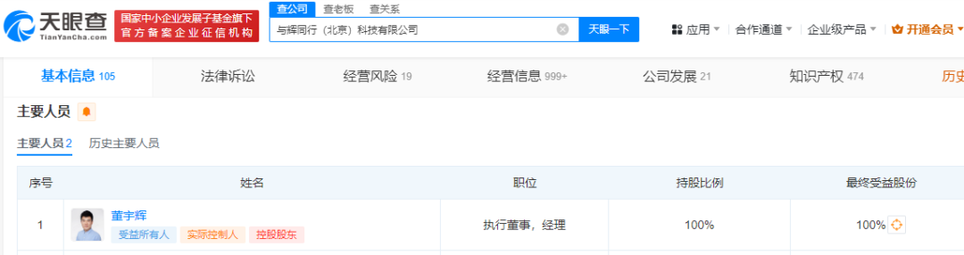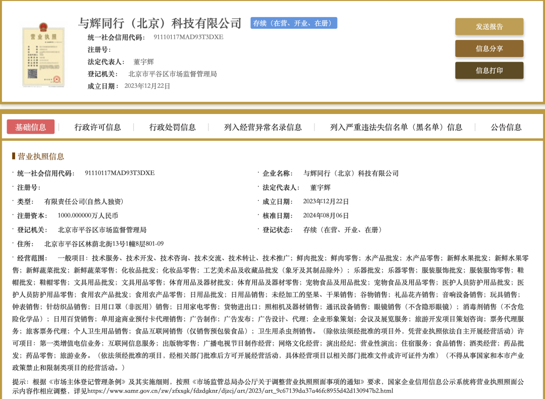 公开信息显示,与辉同行注册资本为1000万元,自然人股东董宇辉认缴额为1000万元,法定代表人为董宇辉。
