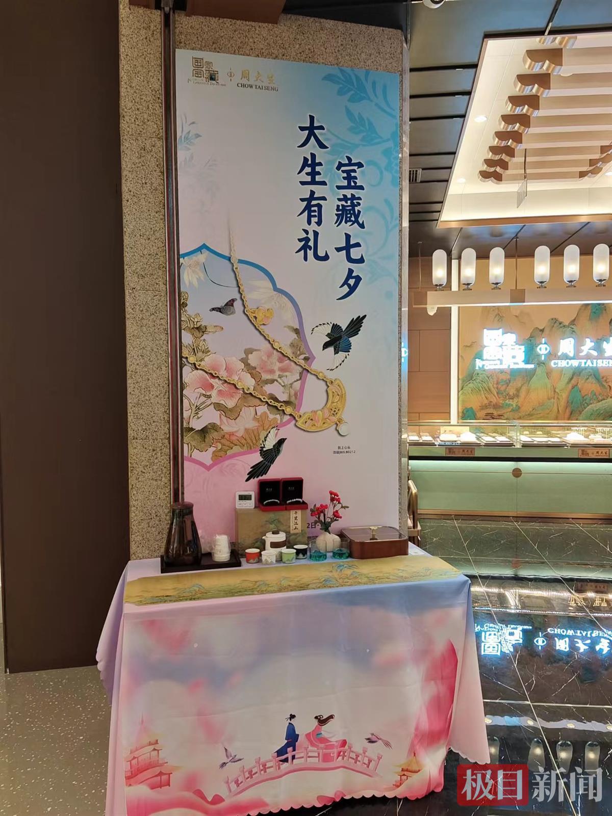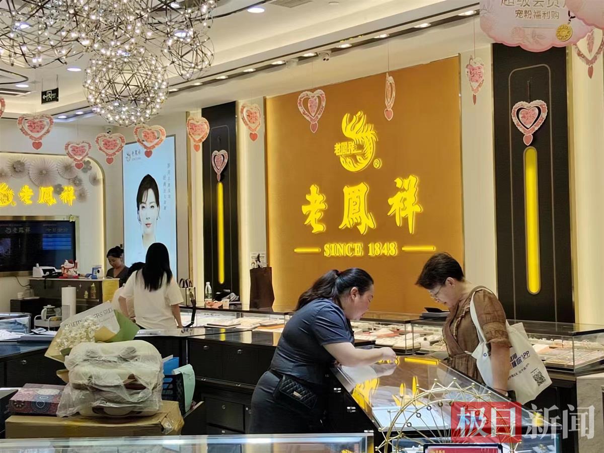在武商城市奥莱一楼的老凤祥门店,店内已经设置了粉红色的七夕装饰,不少情侣在挑选试戴黄金饰品。门店店员告诉记者:“七夕活动期间加大了折扣力度,今日金价是719元/克,按克算的商品每克减60元,镶嵌饰品能打九折,同时能参与商场的会员积分。”她表示,一些寓意美好的饰品比较受消费者的喜爱,如锦鲤锁项链、八宝罗盘吊坠等,销售额排在前列。记者看到,以古法工艺制成的八宝罗盘,以莲花的形态为纹理,寓意祈福圆满,富贵莲年,足金项链的设计则着重使用了古法鎏彩技艺,饰品表面流光溢彩。“七夕期间,商品价格满7700元,即可参与迪士尼盲盒抽奖,盲盒里会有手链和迪士尼卡通人物小金牌,消费者都很喜欢。”店员说。