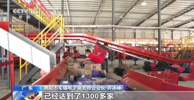 揭阳市军埔电子商务协会会长许冰峰:军埔村在2012年之前是一个典型的农村,依托电商之后,这边产生了一个货物的集散地,全国各地包括周边生产的货物都往这边集中,快递也是围绕大军埔电商圈周边进行设站去运转。现在电商规模实体批发已经达到了1300多家。