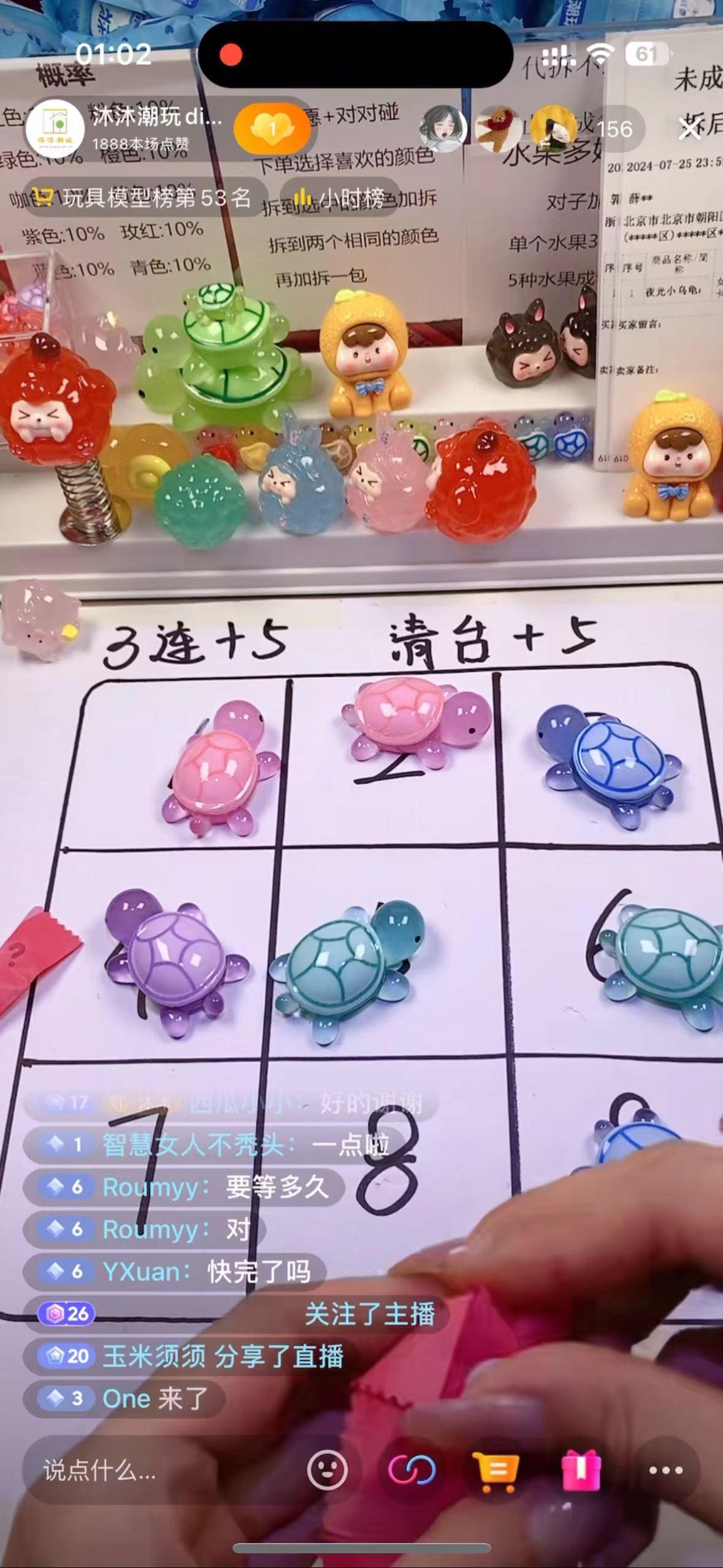 “来,一碰,两碰,三碰,加拆3包!感谢宝子的灯牌,宠一包!”“乌龟对对碰”直播间里,主播麻利地把拆开的树脂乌龟依次放在面前标着1至9数字的九宫格上。背景板上写着不同颜色乌龟的概率和游戏规则。公屏飞速滚动,观众数虽已上万,但仍不断增长,让人眼花缭乱。