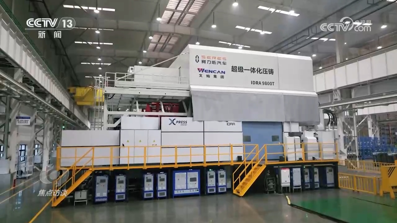 这座三四层楼高的设备是全球首台、全球最大的两板式智能压铸机,赛力斯最新车型上的许多核心零部件将由它一体铸造而成。一体铸造的生产方式,不仅使得零部件的精度更好、安全性更高,更大大提高了压铸的效率。