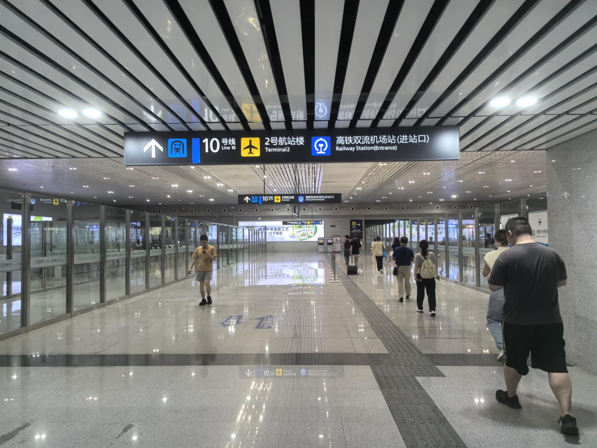 19号线双流机场2航站楼东站与10号线双流机场2航站楼站分别位于高铁双流机场站的两侧,两站换乘通道需穿过高铁站区域,无法直接从付费区进行换乘。为进一步提升出行服务品质,成都地铁坚持需求导向,集中力量技术攻关,通过改造终端设备和后台系统,成功上线单程票“出闸换乘”服务。