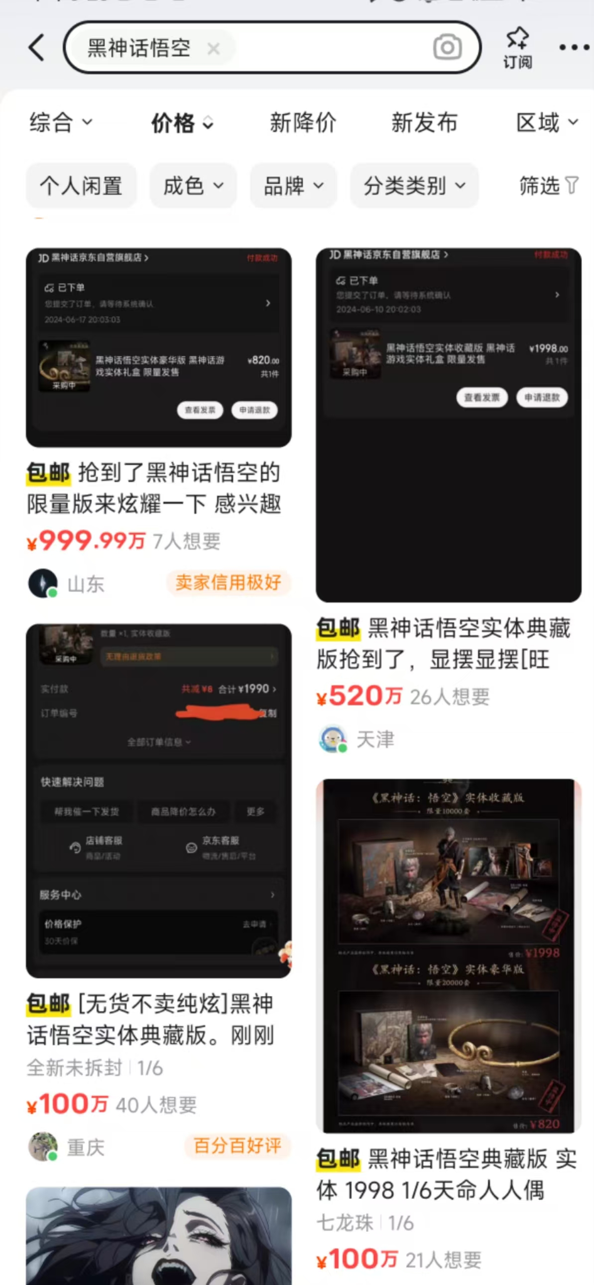 8月20日,澎湃新闻记者在二手平台闲鱼APP上搜索《黑神话:悟空》发现,正式版开售不到一天,已有不少商家在平台以超低价售卖该游戏,不少标价仅为1元或2元,也有商家标出了“999万元”的天价。