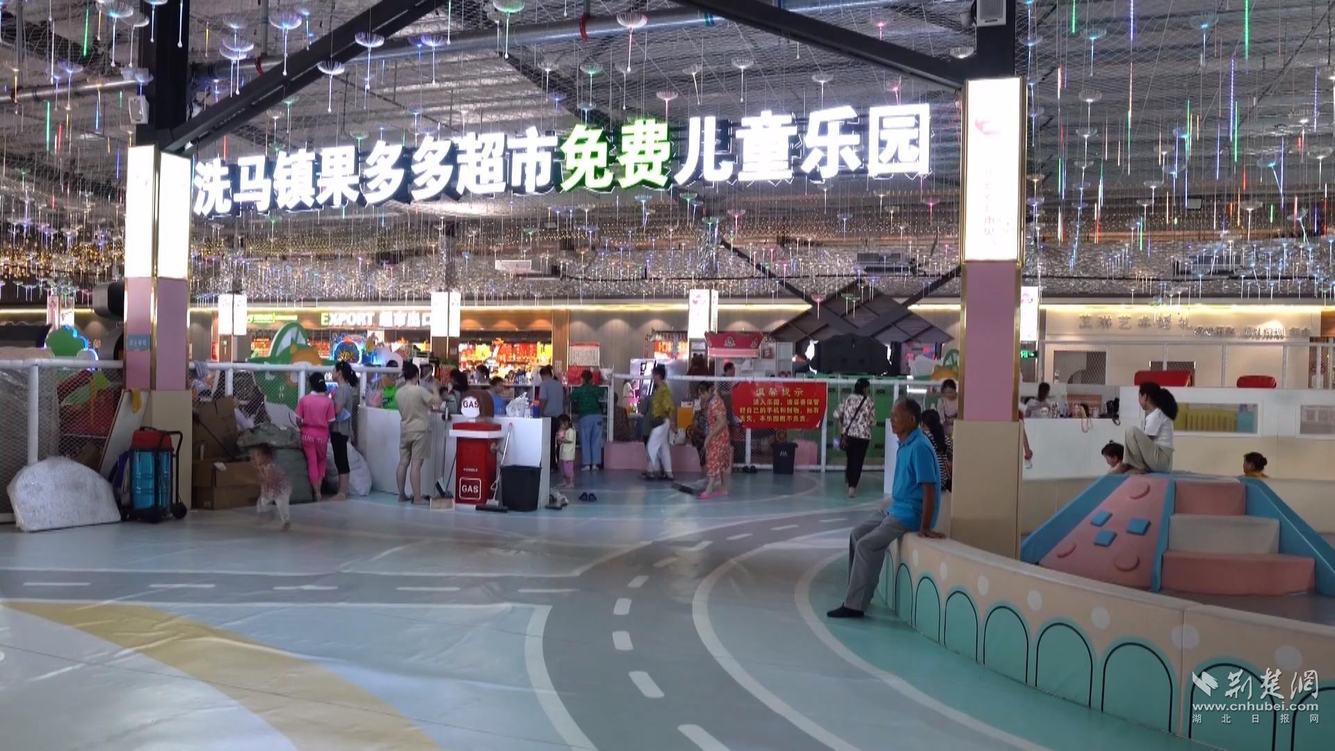 盛夏的傍晚,浠水县洗马镇,占地4万平方米的超市是镇上最热闹的地方。超市外,音乐喷泉、灯光秀、广场舞,吸引了不少居民前来休闲纳凉;超市里,人们忙着采购,生鲜水产区人气最旺,基围虾、花甲等海鲜产品被人们放进了购物车。还有室内4000平方米的儿童乐园,这里是孩子们的最爱。