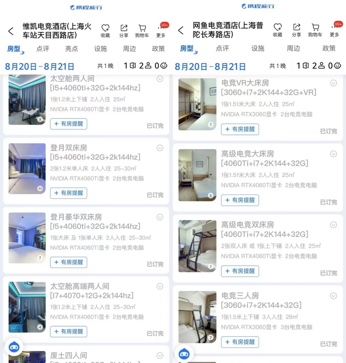 记者从携程旅行App看到,不少电竞酒店的多人房型今晚售罄 图片来源:携程