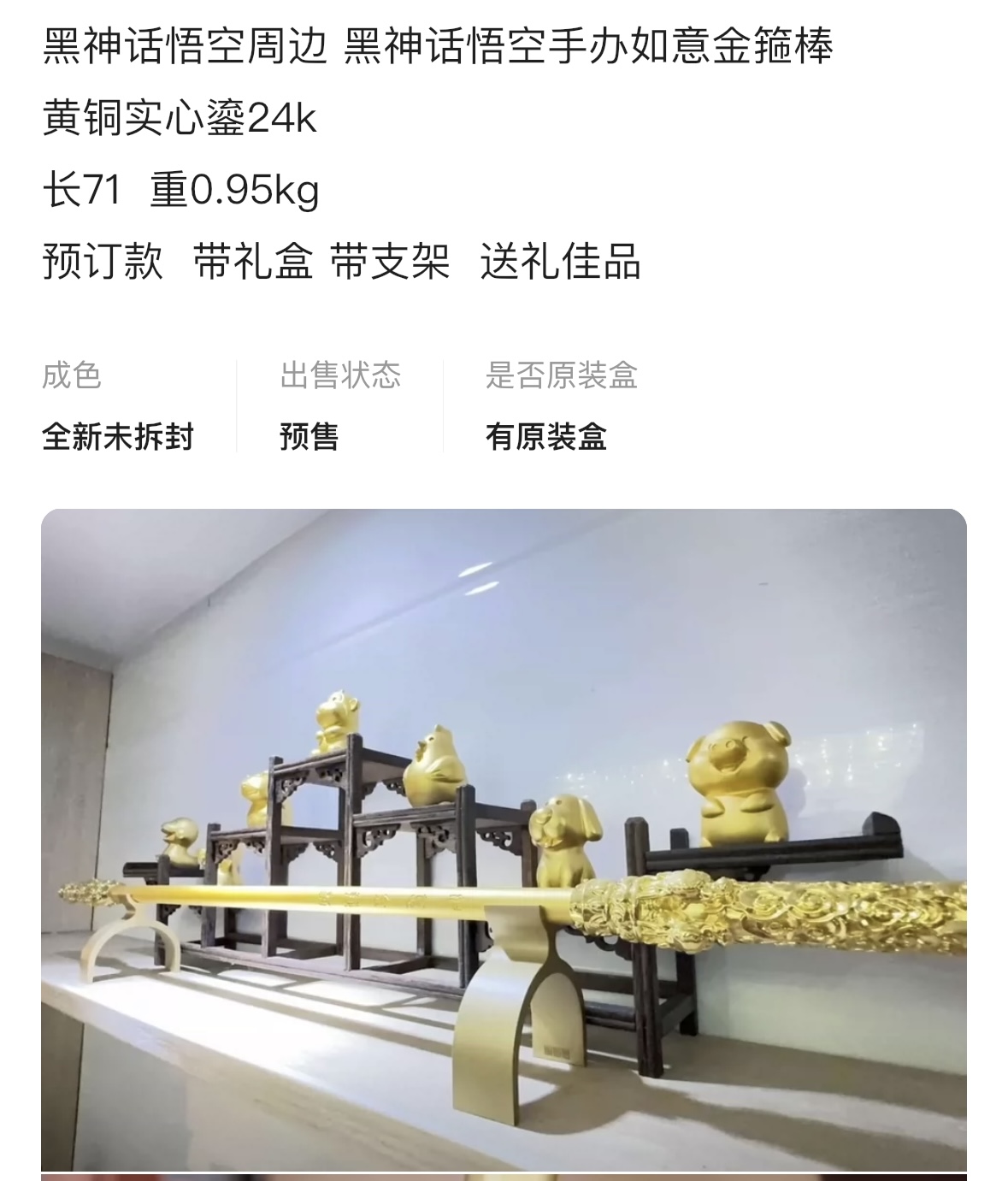 除了官方周边的仿冒款,还有一些卖家盯上了游戏中呼声较高的物件,进行DIY仿制。一款纯银的“黑神话悟空周边吊坠”,售价高达2600元。记者注意到,这款目前只是预售的状态,有7到30天的发货期。尽管如此,已经有不少人和卖家咨询。说到悟空,怎么能少了金箍棒?一款黄铜实心鎏24K金、重0.95KG的金箍棒也在电商平台上进行预售,卖家在介绍中突出了“黑神话悟空手办如意金箍棒”,售价300多元。