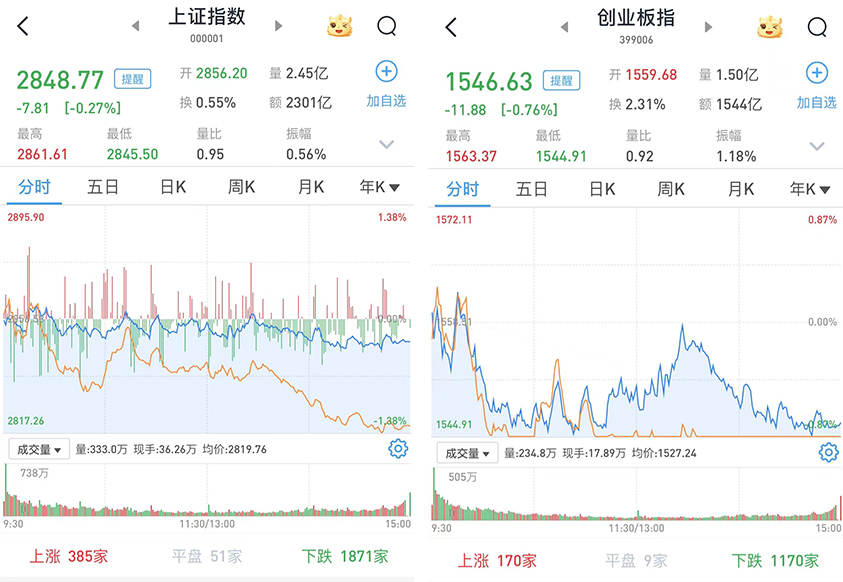 至收盘,上证综指跌0.27%,报2848.77点;科创50指数跌0.88%,报685.53点;深证成指跌0.82%,报8162.18点;创业板指跌0.76%,报1546.63点。