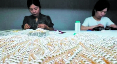 浙江省湖州市德清县一家珍珠生产企业的工人在车间内加工珍珠饰品。 来源:新华社