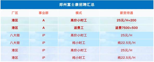 郑州富士康招聘公众号“郑州富工联招聘”连日发布“全年最高价”招聘信息,据该公众号8月24日发布的招聘信息,进入郑州富士康港区事业群A工作有两种模式,一是高价小时工,薪资待遇为25元每小时加200元补贴,二是返费工,薪资待遇为2100元底薪叠加补贴和加班费,且做满3个月获得返费加500元补贴,返费加上500元补贴总体在6500元~8000元之间,8000元的激励是给老员工的。